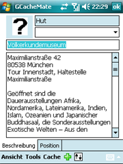 - Setzen von eigenen Caches mit Namen und Beschreibung an der aktuellen GPS Position (GeoTagging)